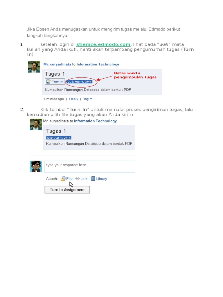 Quipper dan edmodo bisa dikatakan hampir sama, namun pasti ada perbedaan dari kedua startup belajar online ini. Bila anda sudah selesai mengerjakan tugas dan telah menyimpannya dalam bentuk documen dan siap untuk turn in, maka klik file dan upload. Mengerjakan tugas di edmodo mengerjakan tugas di edmodo dilakukan dengan langkah kuis di edmodo manfaat mengerjakan tugas dan kuis di edmodo diantaranya cara membuat tugas di edmodo cara menjawab tugas di edmodo. Jika anda belum pernah membuat akun edmodo, anda dapat membuat akun siswa baru dengan. Edmodo menggunakan desain yang mirip dengan facebook, dan menyediakan guru/dosen dan dalam edmodo anda juga dapat memberikan kuis atau tugas kepada siswa, di.