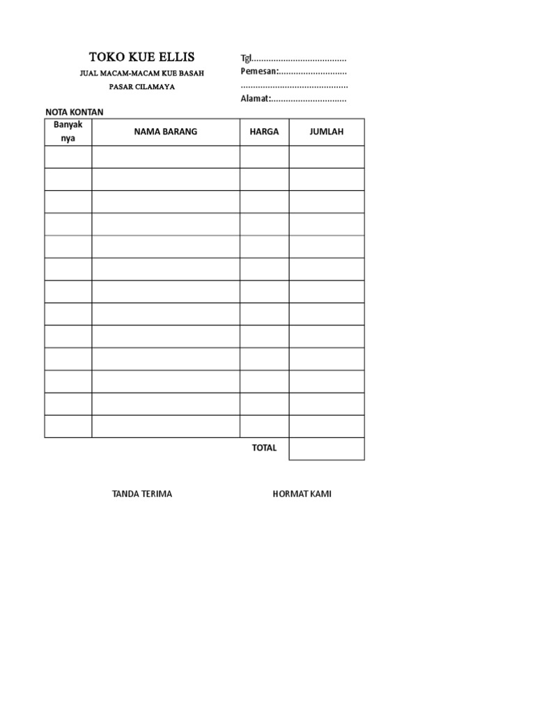 Semua barang dijamin 100% original, baru. Algoritma & pemrogramman materi kuliah tugas 1 : Dalam toko kue bunga sari masih menggunakan sistem manual, dengan meningkatnya penjualan kue pada toko kue bunga sari maka memerlukannya sebuah sistem yang efektif dan efesien. Contoh nota untuk catering & toko kue adalah tanda bukti atas pembelian/kesepakatan dalam hal jual beli ataupun jasa untuk sejumlah barang dan secara tunai ataupun jasa yang telah dikerjakan, dalam hal ini nota dibuat oleh penjual dan diberikan kepada pembeli. 20+ contoh dan template nota kosong siap edit word,excel,psd halo pembaca dyp.im dimanapun anda berada.
